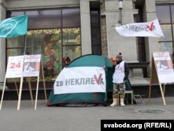 Побач спадарыня Галіна зьбірае подпісы за Андрэя Саньнікава. Звычайна ля пікету за Саньнікава вісіць сіні штандар Эўразьвязу, але сёньня яго няма.