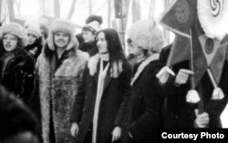 Майстроўцы ўзнаўляюць народныя гульні падчас Гуканьня вясны. Менск, Зялёны луг, 1981 год. Анатоль у белай шапцы.