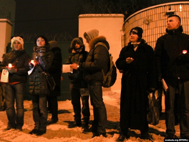 Ля турмы на Акрэсьціна сабралася каля 200 чалавек. Многія трымаюць у руках запаленыя сьвечкі як знак салідарнасьці з палітычнымі вязьнямі.