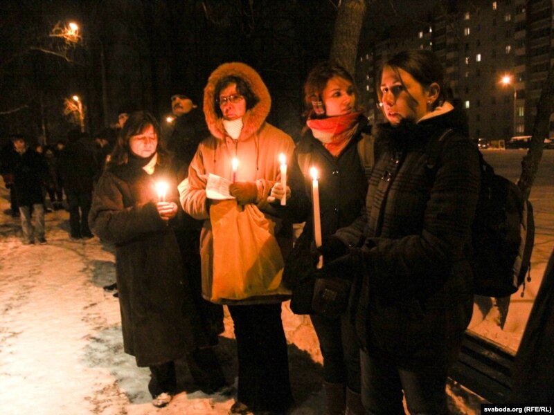 18.50 Пасьля папярэджаннья з боку міліцыянтаў моладзевыя актывісты Міхась Пашкевіч і Франак Вячорка заклікалі ўсіх адысьціся ад сьцяны турмы на дзясятак мэтраў. Перад тым як адступіць, усе паставілі запаленыя сьвечкі ў сьнег ля сьцяны.