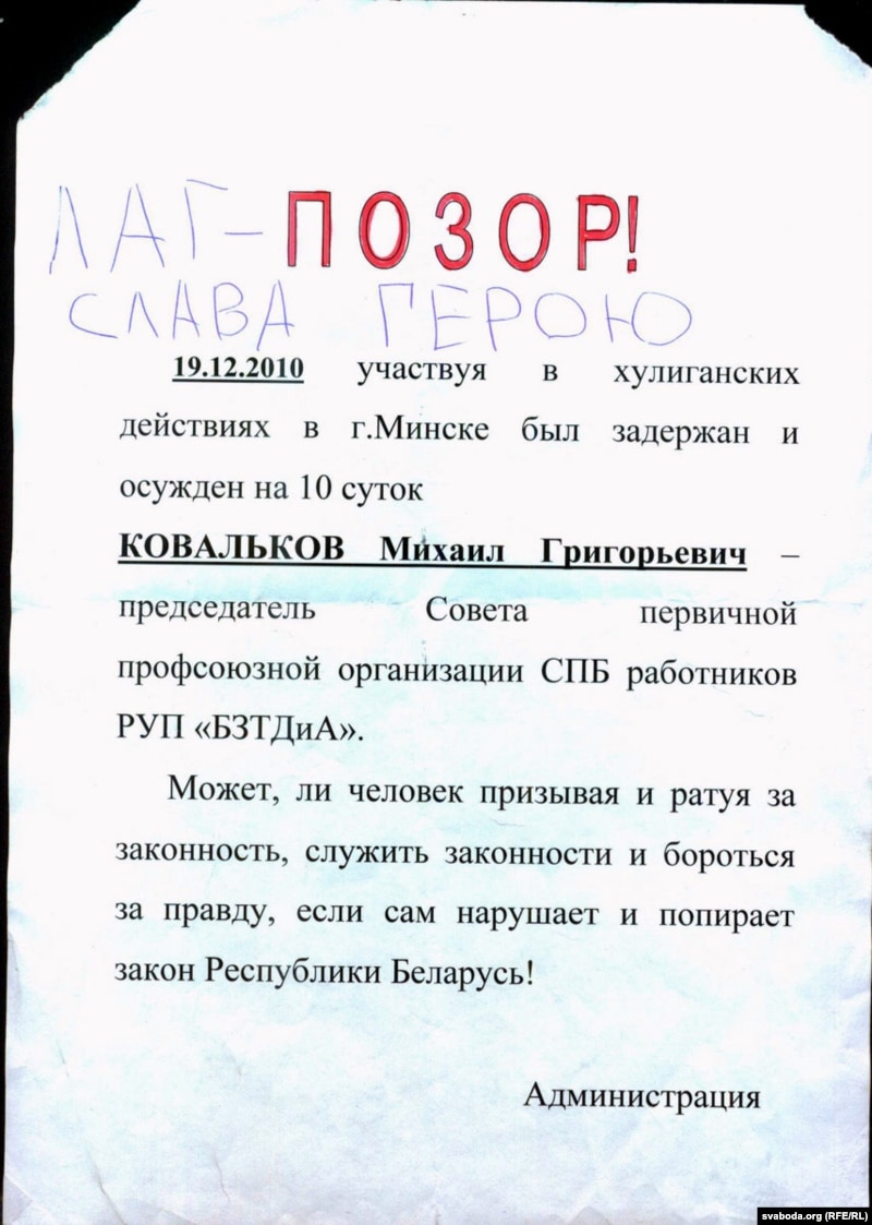 Учора, 3 сьнежня, «Свабода» расказала, што адміністрацыя Бабруйскага заводу трактарных дэталяў і агрэгатаў намагаецца скампрамэтаваць старшыню заводзкай суполкі Свабоднага прафсаюзу Беларускага Міхаіла Кавалькова. Сёньня мы атрымалі з Бабруйску фатакопіі саматужных плякатаў, з дапамогай якіх мясцовыя ідэолягі спрабуюць ганьбіць удзельніка акцыі пратэсту на Плошчы незалежнасьці 19 снежня Міхаіла Кавалькова..