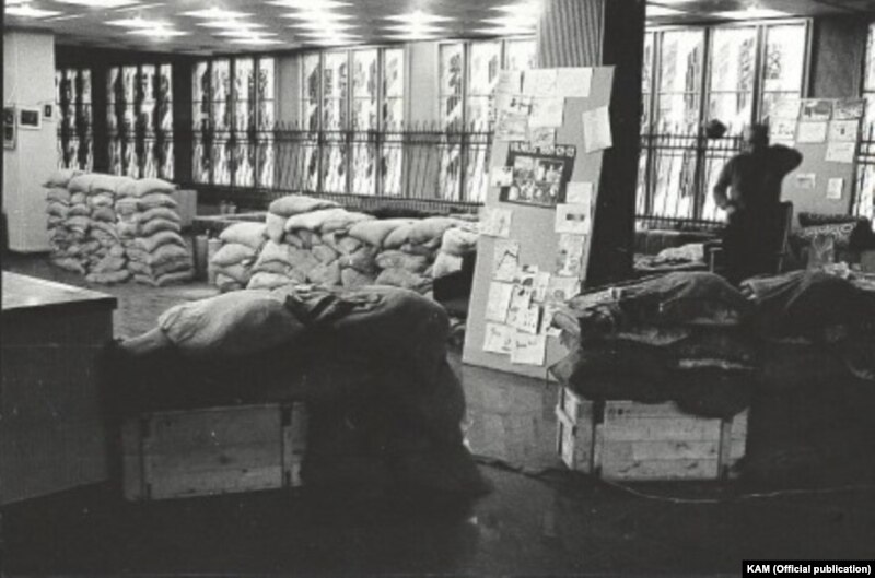 Паўсюдна -- мяхі зь пяском, барыкады з мэблі. У калідорах – добраахвотнікі, і толькі ў дзясятка зь іх я ўбачыў стрэльбы – вялізныя, пачатку ХХ стагодзьдзя.