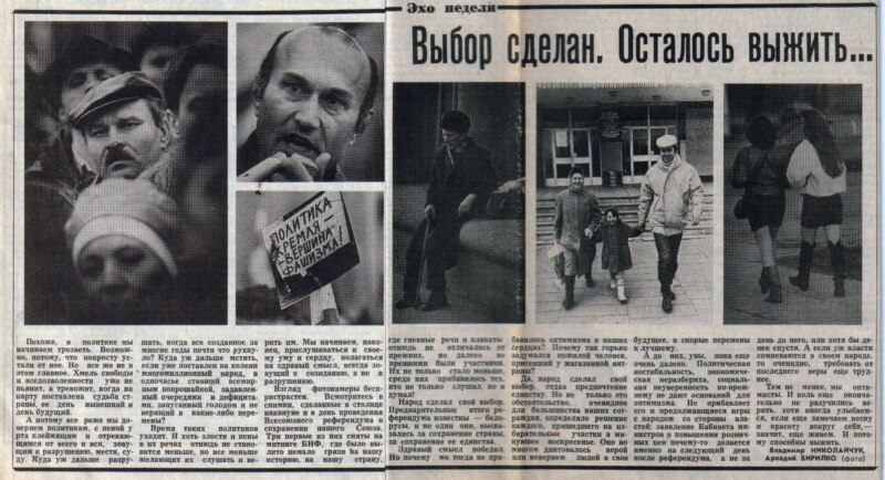 “Углядзіцеся ў здымкі, зробленыя ў сталіцы напярэдадні і ў дзень правядзеньня Усесаюзнага рэфэрэндуму аб захаваньні нашага Саюза. Тры першыя зь іх зьнятыя га мітынгу БНФ, дзе было выліта нямала бруду на нашу гісторыю, на нашу краіну..." (Тут ізноў прыпыню цытаваньне. Ня памятаю, каб калі-небудзь хто-небудзь на мітынгах БНФ казаў нешта дрэннае пра пераможцаў бітвы пад Воршай, паўстанцаў Каліноўскага ці заснавальнікаў “Нашай Нівы”, пляжыў ВКЛ ці БНР. Але казалі пра беларуска-расейскую вайну 17 стагодзьдзя, калі войскі цара Аляксея Міхайлавіча зьнішчылі палову беларусаў, пра Курапаты, пра ГУЛаг, пра кінутых “саюзным цэнтрам” у бядзе жыхароў чарнобыльскіх раёнаў).