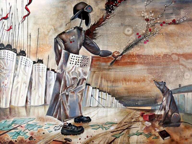 Марачкін: “На напісаньне гэтай карціны мяне падштурхнулі падзеі 19 сьнежня. Я ў мастацкай форме адлюстраваў тое, што бачыў на свае вочы на Плошчы Незалежнасьці. На карціне зь левага боку – натоўп са шчытамі, і твары там падобныя на д’яблавы, з рожкамі. Як мастак, я не магу ўспрымаць гэтых шчытаносцаў, гэтых чорных зданяў, якія накінуліся і зьбілі паэта Ўладзімера Някляева, як анёлаў. Гэта не анёлы. У цэнтры – здань у зімовай шапцы. Дарэчы, я маляваў карціну яшчэ да таго, як Кадафі адзеў зімовую шапку. Так у мяне выйшла, хлопцы потым сьмяяліся. Я ў алегарычнай, мэтафарычнай форме паказаў, што гэтак званыя “пераможцы” ўручаюць кветку нейкай істоце – ці то пацуку, ці то сабаку. На карціне прысутнічаюць як асацыяцыя і гаражы, і шкло пабітае. Але там не канкрэтныя людзі. Вусатых вы там не пабачыце. Ці ж я ня маю права выказаць мастацкімі сродкамі тое, што адбылося? Праўда, калі б мне хто-небудзь прапанаваў: праілюстраваць кніжачку Ўладзімера Падгола – зборнік выказваньняў начальніка краіны, то я, мабыць, ня змог бы. Як можна праілюстраваць, напрыклад, выказваньне: “Калі перамогуць апазыцыянэры, яны ўсіх нас пасадзяць на кол”? Уяўляеш сабе карціну? Альбо як можна праілюстраваць выказваньне: “Дзеля карысьці Беларусі я на карачках папаўзу з Маскву”? Нават і ўявіць сабе страшнавата”.