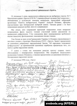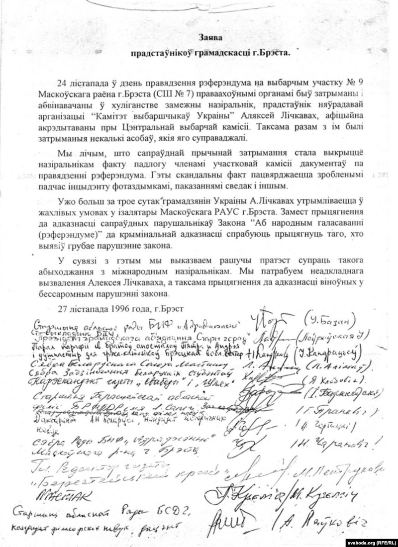 Заява-пратэст ад імя грамадзкасьці Берасьця супраць затрыманьня ўкраінскіх назіральнікаў пасьля рэфэрэндуму 1996 году. Першы подпіс — Ул.Базан. 1996
