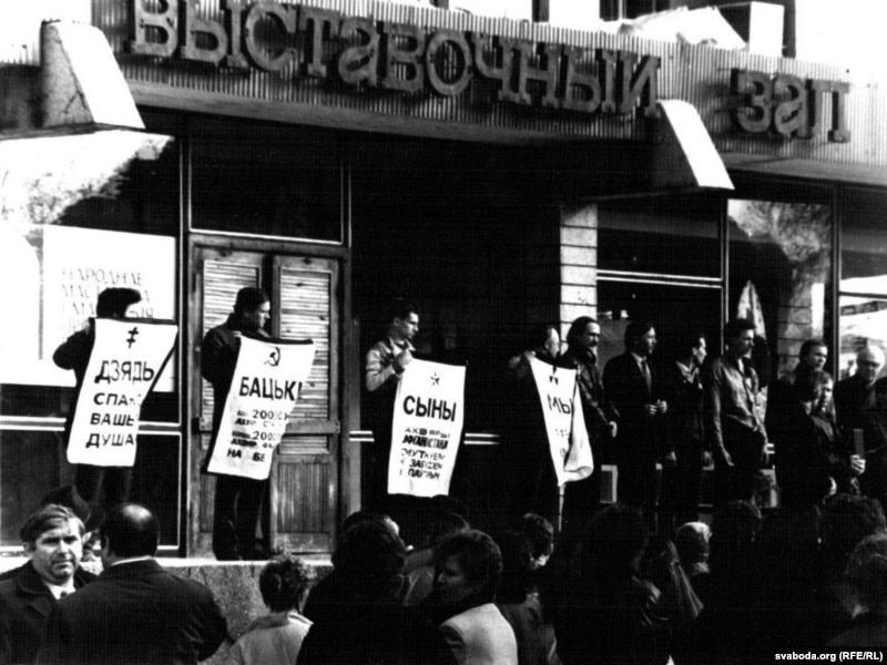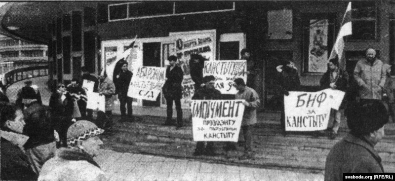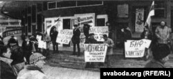 Пікет у абарону незалежнасьці. Берасьце. 2 красавіка 1996 году. У.Базан — крайні справа (архіў І.Бараноўскага)