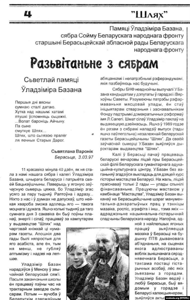 Імя Ўладзімера Базана ў Берасьці, дзе ўсе навідавоку, згадвае кожны суразмоўца. Маладзейшыя, якія ўжо не засьпелі яго ў жывых, дагэтуль карыстаюцца ягоным даробкам. Уладзімер Базан — сапраўдная постаць беларускага адраджэньня, чалавек, які стаў крыніцай шматлікіх незалежніцкіх спраў. Менавіта ён удзельнічаў у стварэньні першых незалежных арганізацый Берасьця, свабоднага друку, беларускамоўных клясаў у школах і ўвогуле, здаецца, у 80–90-х не было такой карыснай і важнай справы, да якой не прычыніўся б Уладзімер Базан.