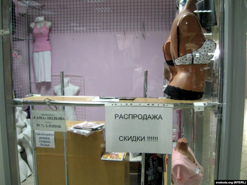 Прадпрымальніца Кацярына: «Прадаём тавар па цэнах закупкі, каб хоць якія-кольвечы грошы былі ў кішэні. Прыбытку ніякага! Але ж хлеб за штосьці купіць трэба, за кватэру заплаціць трэба. Во куртка вісіць — гэта нашы грошы. Хоць бы крыху вярнуць. Калі нічога ня зьменіцца, мы — банкруты».