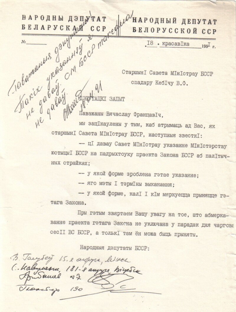 18 красавіка я аднёс у прыёмную старшыні Савету Міністраў Вячаслава Кебіча афіцыйны дэпутацкі запыт, які мы падпісалі разам з Валянцінам Голубевым, Уладзімерам Грыбанавым Барысам Гюнтэрам: