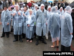 18:15 Каля Палаца прафсаюзаў — група маладых людзей у белых плашчах-дажджавіках з надпісамі: «Моладзевы атрад аховы правапарадку» — гэта чальцы БРСМ.
