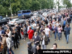 19:00 Уздоўж агароджы Кастрычніцкай плошчы ў бок палацу прафсаюзаў ідуць разам дзясяткі людзей і пляскаюць у далоні.
