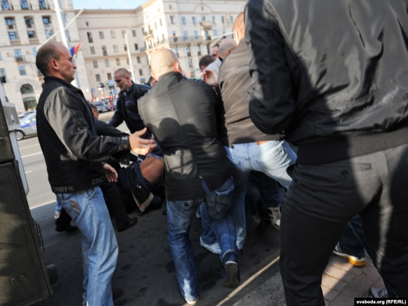 «Вконтакте». Людзі даволі масава супраціўляюцца затрыманню асобамі ў цывільным. Эўрарадыё: Антон Матолька: «У мяне спрабавалі разбіць аб’ектыў, бачылі на зямлі рацыю, флэшкі, успышкі». |