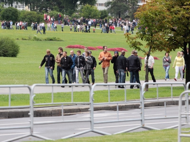 10:55 Узмоцненыя захады бясьпекі на падыходах да месца правядзеньня вайсковага параду. Яшчэ да скрыжаваньня Пераможцаў і Машэрава неабходна прайсьці тры міліцэйскія кардоны, людзей прапускаюць толькі праз турнікеты. Міліцыянты праз гукаўзмацняльнікі папярэджваюць, каб грамадзяне не зьбіраліся ў адным месцы, а праходзілі на глядацкія пляцоўкі і займалі месцы ў адпаведнасьці з запрашэньнямі. Людзей без запрашэньняў накіроўваюць у глядацкі сэктар каля гатэлю «Плянэта».