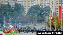 12:45 Па праспэкце Незалежнасьці пад чырвонымі савецкімі сьцягамі праехала калёна танкаў, самаходных артылерыйскіх установак ды іншай тэхнікі, якая вярталася пасьля параду ў распалажэньне частак. Рух на праспэкце перакрыты цалкам.