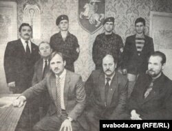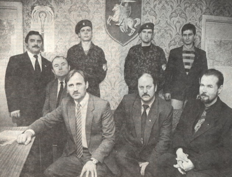 Кіраўніцтва Беларускага згуртаваньня вайскоўцаў, лета 1995 г. Зьлева направа: Анатоль Гурыновіч, Лявон Дзейка, Мікола Статкевіч, Алесь Станкевіч, Сяргей Чыслаў (стаіць), Мікола Бірукоў. У форме — сябры ДРАБ (дружыны рэгіянальнай аховы і бясьпекі)