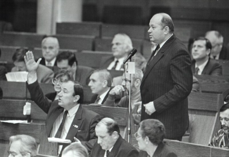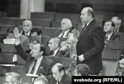 Вярхоўны Савет гэтае пытаньне пад рознымі падставамі адмаўляўся разглядаць, шукаў усялякія зачэпкі, абы толькі гэтае рашэньне не прымаць. Большасьць дэпутатаў разумела, што ў тых умовах новыя выбары асабіста ім ніякай пэрспэктывы не паказваюць. Але, на мой погляд, гэта быў бы далейшы крок наперад: гэта быў бы ўжо новы орган, які б адпавядаў умовам сувэрэннай дзяржавы, калі ў краіне спынілася кіруючая роля камуністычнай партыі. Гэтае пытаньне было пасьпяхова заваленае, заблякаванае. І ў гэтым кірунку спрацаваў тагачасны старшыня ВС. І далей пайшоў пэрыяд паступовага, ня вельмі бурнага намэнклятурнага рэваншу. Тады ўжо ўсё больш і больш станавіўся вядомы людзям народны дэпутат Аляксандар Лукашэнка зь яго палымянымі выкрывальніцкімі прамовамі, калі ён з такім вось патасам граміў усіх за злоўжываньні, за крадзеж, за тое, што "яны" адкажуць перад народам і так далей".