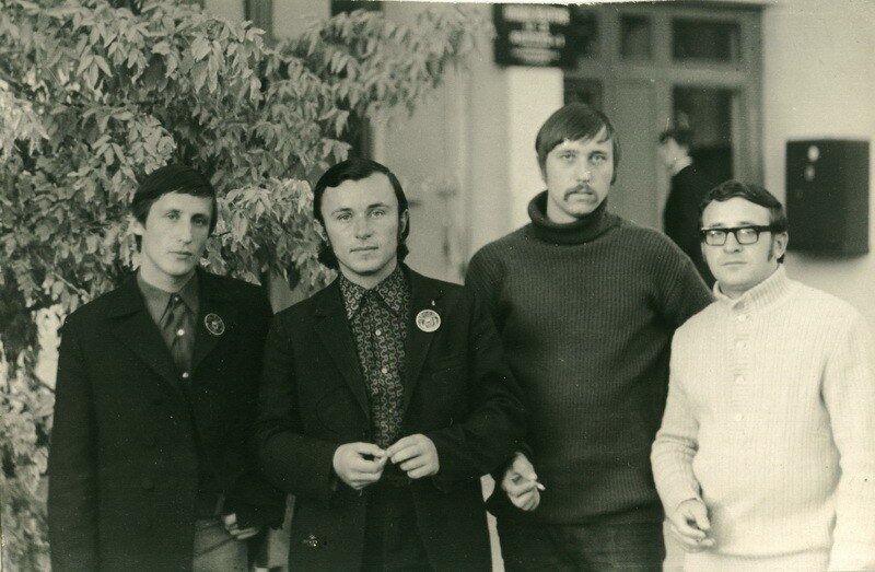 Выпускнікі МРТІ падчас працы на касмадроме Байканур. Зьлева направа: Вячаслаў Фрэнкель, Лявон Дзейка, Пятро Кавалёў, Леў Марголін. Восень 1973 г.