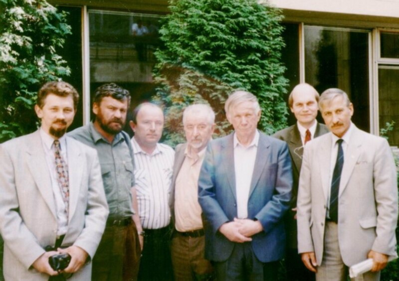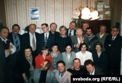 Падчас зьезду БНФ. Дом літаратараў. Зьлева направа: Сяргей Навумчык, Уладзімер Арлоў, Лявон Дзейка, Рыгор Барадулін, Васіль Быкаў, Лявон Баршчэўскі, Мікалай Крыжаноўскі. 1995 г.