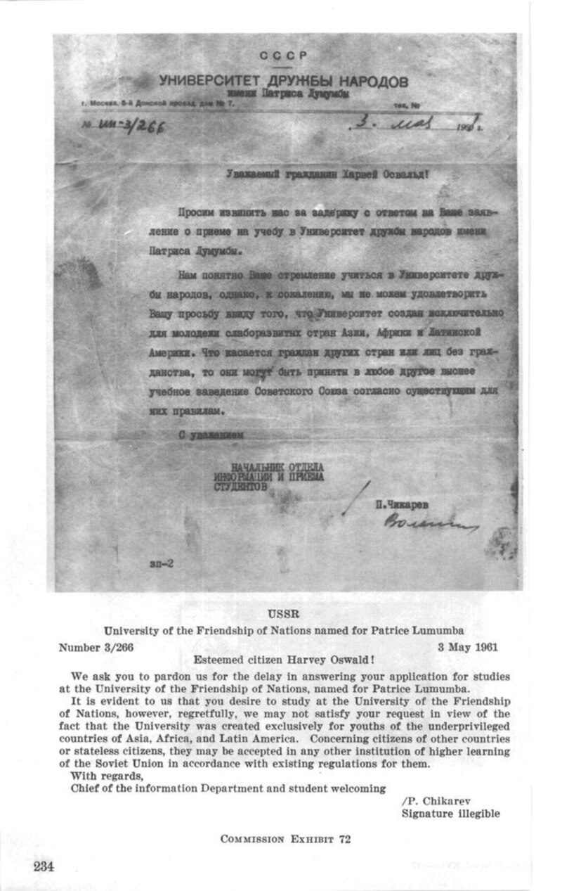У траўні прыйшла адмова з Унівэрсытэту дружбы народаў, куды Освальд спрабаваў паступіць – унівэрсытэт браў студэнтаў з краінаў трэцяга сьвету, Освальду рэкамэндавалі зьвяртацца ў любую іншую ВНУ. Але навучаньне яго ўжо не цікавіла. Ён зрабіў іншы выбар і трымаў яго ў таямніцы.