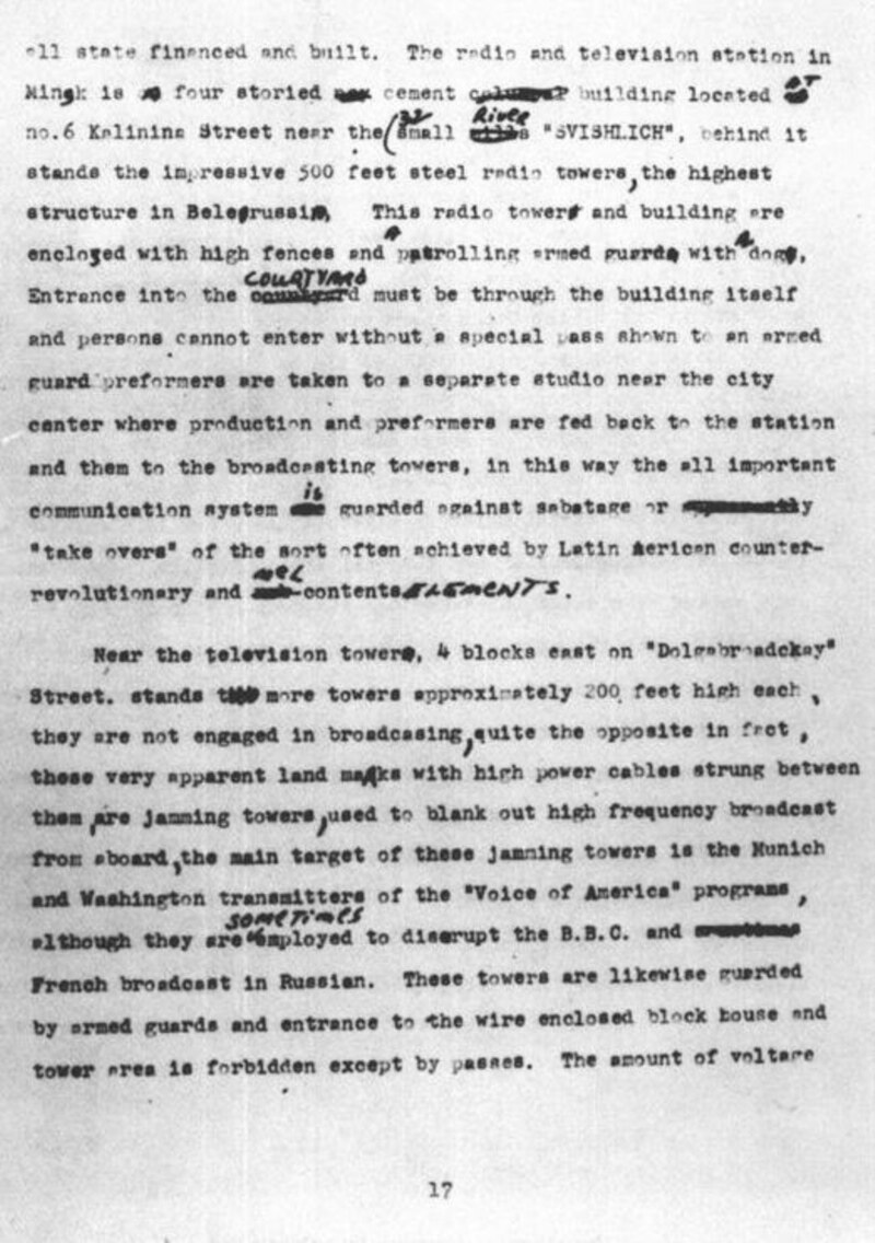 З іроніяй і сумам думаеш пра велізарнае марнатраўства і высілкі савецкага ўраду дзеля таго, каб не дапусьціць ідэі іншых народаў. Але частоты глушэньня складаюць толькі палову прапагандысцкіх праграмаў Радыё Масквы, якія можна пачуць на любым кароткахвалёвым радыё ў Злучаных Штатах – і без глушэньня. Праграмы Радыё Масквы запэўніваюць людзей, што жалезнай заслоны больш няма, ніколі не было, і яна зьяўляецца паклёпам на Савецкі Саюз, прыдуманым рэакцыянэрамі, sic!!.