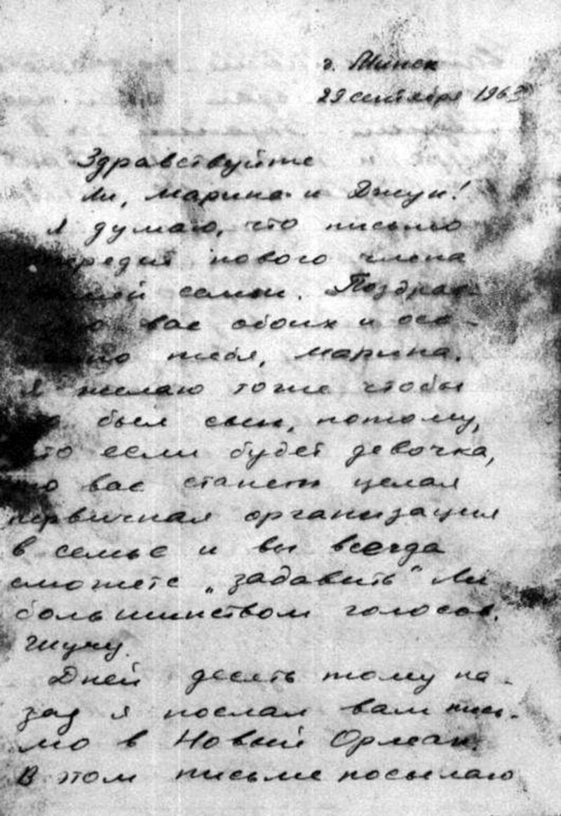 Сёньня, калі прыйшоў з працы, атрымаў ваш ліст. Адразу ж адказваю, бо перапоўнены радасьцю. Я ўжо хаджу на заняткі. Займаюся на другім курсе. Заўтра апошні дзень пайду на працу – я звольніўся, таму што займаюся па дзённай сыстэме з адрывам ад вытворчасьці. Марына, ты не пашкадуеш, калі выпішаш замест “Советской Белоруссии” “Известия” зь нядзельным дадаткам “Неделя”. У гэтым дадатку вельмі шмат цікавага, бо ён вялікі па аб’ёме друкаваных аркушаў (прыблізна газэт 10). У ім ёсьць цікавыя апавяданьні. Так, часопісы вы, відаць, атрымаеце бліжэйшым часам. Рэч у тым, што я паслаў іх не авіяпоштай (яны даволі цяжкія для самалёта), а параходам. Так што хутка атрымаеце. Я падрыхтаваў яшчэ кучу часопісаў. Заўтра вышлю. Кніг у двух пакетах, якія Лі паслаў мне, я яшчэ не атрымаў, але, відаць, ён іх нядаўна толькі паслаў, таму яны не пасьпелі яшчэ даехаць, але думаю, што хутка даедуць.