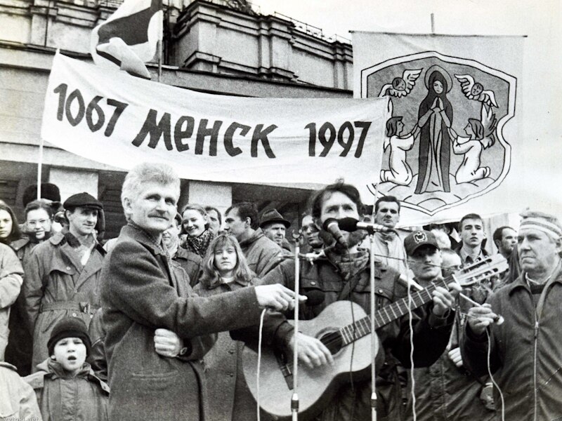 Мітынг з нагоды 930-годзьдзя Менску каля Тэатру опэры і балету. 1997. Алесь Бяляцкі, Андрэй Мельнікаў. Фота: vytoki.net