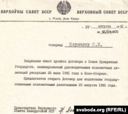 “Паважаны Старшыня Вярхоўнага Савета! -- пісалі мы. – У сувязі з нечаканым паведамленьнем газэты “Известия “ 12 жніўня гэтага года аб тым, што “паўнамоцная дэлегацыя” БССР будзе падпісаваць 20 жніўня Саюзны Дагавор, са зьмененым тэкстам якога не знаёмыя народныя дэпутаты БССР і на Вярхоўным Савеце ён не абмяркоўваўся, заяўляем аб неправамернасьці, безадказнасьці Вашых дзеяньняў. Вы імкнецеся заключыць дагавор пра лёс Беларусі без праходжаньня ўсіх неабходных у такіх выпадках экспэртызаў, абмеркаваньняў і рашэньняў. Калі, нягледзячы ні на што, іакі дагавор будзе Вамі падпісаны, ён усё роўна ня будзе мець юрыдычнай, прававой і палітычнай сілы, бо ня можа быць прызнаны ні беларускім грамадзтвам, ні міжнароднай супольнасьцю. Фактычна, празмова ідзе аб падпісаньні новага каланіяльнага для Беларусі дагавора. Крок, які Вы зьбіраецеся зрабіць, ставіць пытаньні аб Вашай асабістай адказнасьці перад Беларускім народам» Ліст падпісалі пяць дэпутатаў – тыя, хто быў у той дзень у будынку Дома ўраду -- Зянон Пазьняк, Уладзімер Заблоцкі, Сяргей Навумчык, Уладзімер Новік, Яўген Новікаў”.