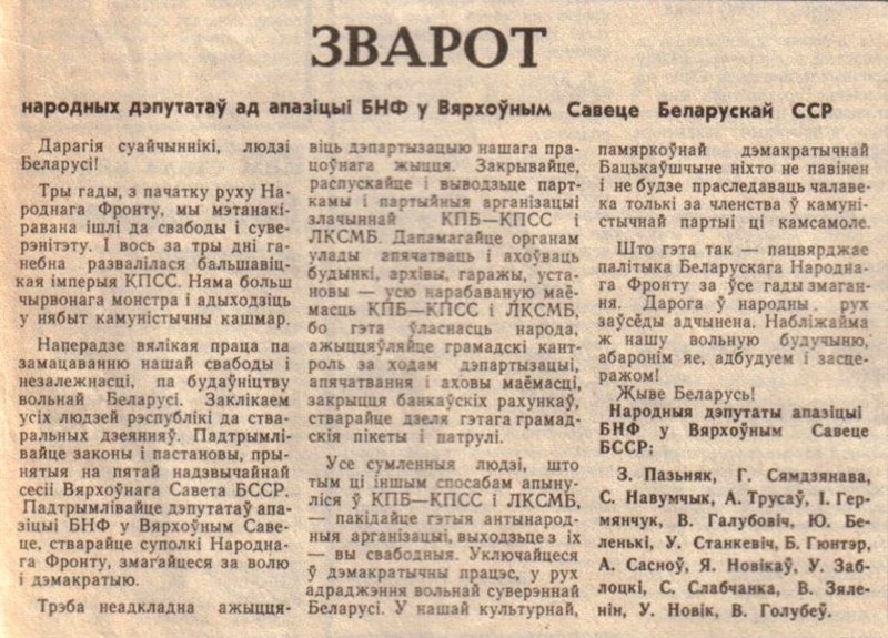 Мы, дэпутаты Фронту, прапанавалі ў гэтых умовах вырашыць адразу і пытаньне з назвай краіны, скасаваўшы назву БССР і назвацца – Рэспубліка Беларусь. Але гэтае рашэньне адклалі на наступную сэсію.