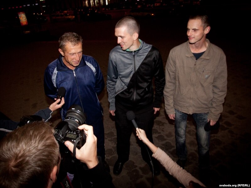 Былы палітвязень Сяргей Казакоў (з правага боку) сустракае Дзьмітрыя Буланава і Аляксандра Малчанава