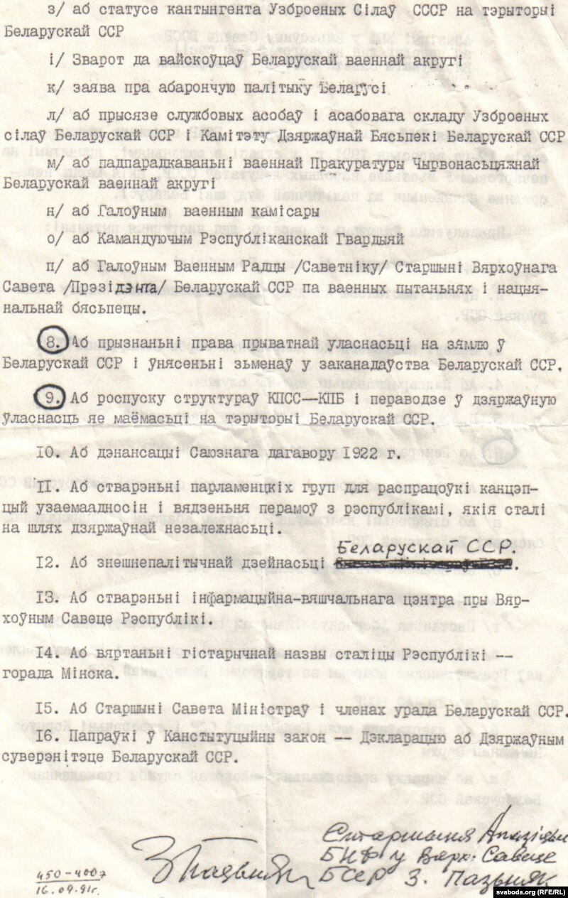 За дваццаць дзён – з 26 жніўня да 16 верасьня 1991 г. – мы падрыхтавалі і прадставілі ў Вярхоўны Савет 31 законапраект для нечарговай сэсіі ВС. Большасьць зь іх тычылася дзяржаўнага будаўніцтва і абароны – таго, без чаго не магла існаваць толькі што ўтвораная краіна (пазьней нашыя прапановы будуць прынятыя). Мы прапанавалі Прэзыдыюму ВС 16 пунктаў парадку дня – аб грамадзянстве, аб уласнай мытні, аб замежнапалітычянай дзейнасьці, аб прызнаньні права прыватнай уласнасьці на зямлю і ўнясеньні зьменаў у заканадаўства, аб дэнансацыі Саюзнага дагавору 1922 году і інш. Быў і аб’ёмны "вайсковы блёк", за падрыхтоўку якога адказвала Галіна Сямдзянава – ён складаўся з 16 законапраектаў, якія падводзілі юрыдычную базу пад стварэньне ўласнага войска, сыстэмы памежнай аховы, уласнай вайсковай пракуратуры і гэтай далей.