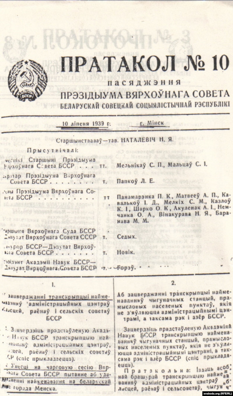 Пратакол пасяджэньня Прэзыдыюму ВС БССР аб вынясесеньні на сэсію ВС пытаньня аб пераназове Менску, 1939 г.