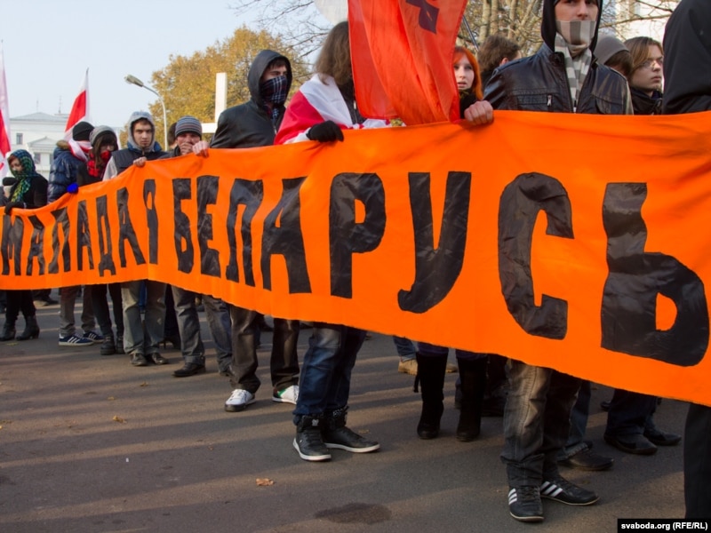 11:15 Актывісты «Маладой Беларусі» трымаюць партрэты палітвязьняў, скандуюць «Жыве Беларусь!», «Незалежнасьць», імёны палітвязьняў. Нясуць расьцяжку «Моладзь ідзе — Беларусь жыве». «Ціхары» ідуць і лузгаюць семкі.