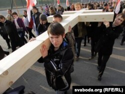 Палажанка: «У Беларусі мала што мяняецца. Штогод мы з новымі ахвярамі. Сёлета ідзем зь вялікім сымбалем тых ахвяраў, якія Беларусь панесла за гэты год. Таму мы нясем вялікі эўфрасіньеўскі крыж». Сярод тых, хто нясе крыж, былы палітвязень Уладзь Яроменак.