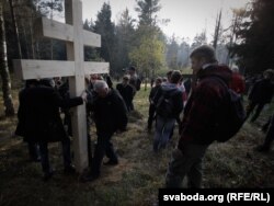 9.15 Актывітс КХП-БНФ Алесь Чахольскі прывёз на мікраўтобусе брусы. Ён пачынае зьбіраць крыжы.