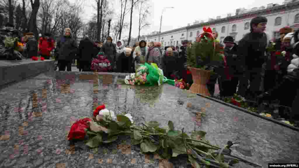 Ускладаньне кветак да помніка Максіма Багдановіча