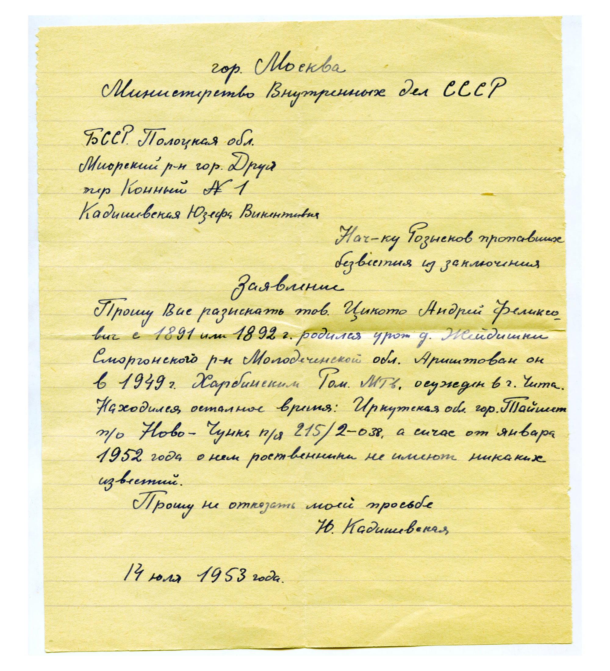 Ліст сястры Юліі Кадышэўскай у МУС СССР у справе росшуку архімандрыта А. Цікоты. Друя, 1953 г.