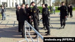 17:40 Пляцоўка месца збору агароджаная турнікетамі, стацыянарных рамак-мэталяшукальнікаў няма, міліцыянты правяраюць тых, хто ўваходзіць, ручнымі мэталяшукальнікамі. Усярэдзіну ўжо прайшло некалькі дзясяткаў чалавек. Бальшыня людзей, якія падыходзяць, стаяць абапал, за агароджу не праходзяць.