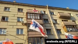 19:15 Дзяўчына на гаўбцы дому № 36 па вуліцы Сурганава вітае калёну бел-чырвона-белым сьцягам.