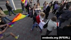 19:14 Адзін з актывістаў ЛГБТ-руху Сяргей Андросенка паскардзіўся карэспандэнту Радыё Свабода, што невядомыя маладыя людзі зламалі два вясёлкавыя сьцягі і папрасілі прадстаўнікоў сэксуальных меншасьцяў перайсьці з цэнтру ў хвост калёны.