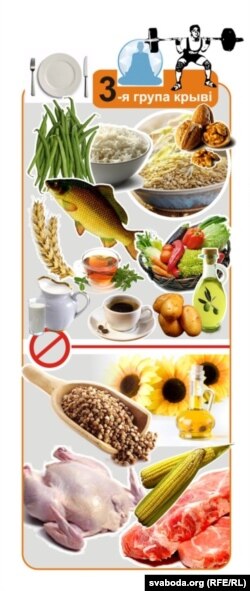 Ключ да здароўя для людзей з 3-й групай — збалянсаванае харчаваньне. Варта выбіраць для ежы розныя злакі ды крупы, перавагу аддаваць рысу і аўсу. Кукуруза і грэчка будуць зьніжаць абмен рэчываў, аслабляць дзеяньне інсуліну, што прыводзіць да ацёкаў ды стамляльнасьці. Варта пазьбягаць жыта, у якім ёсьць лектын.