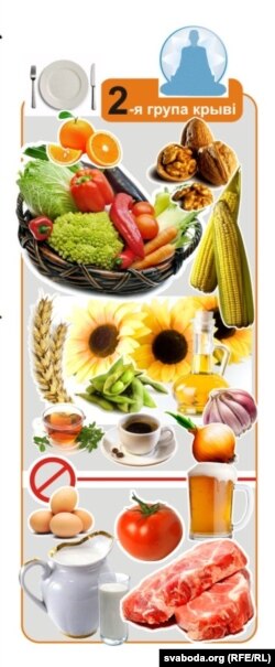Паводле характару рэкамэндаванага харчаваньня людзі, якія маюць 2-ю групу крыві, — вэгетарыянцы. У іх кіслотнасьць страўнікавага соку паніжаная, а таму мясная ежа дрэнна ператраўляецца.