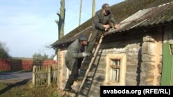 Далей іду на стук малаткоў і хутка бачу на даху прыземістай хаты двух пажылых, зарослых мужыкоў, што прыбіваюць шыфэр.