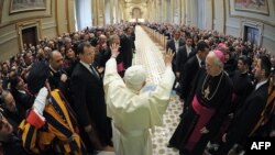 Дарагія браты, я дзякую вам ад усяго сэрца за ўсю любоў і працу, празь якую вы несьлі са мной цяжар майго служэньня, і прашу прабачэньня ўсіх маіх недахопаў. Цяпер мы давяраем сьвяты Касьцёл апецы Найвышэйшага Пастыра, Пана нашага Ісуса Хрыста, і просім Яго Найсьвяцейшую Маці Марыю, каб дапамагала сваёй мацярынскай дабрынёй Айцам Кардыналам у абраньні новага Папы.