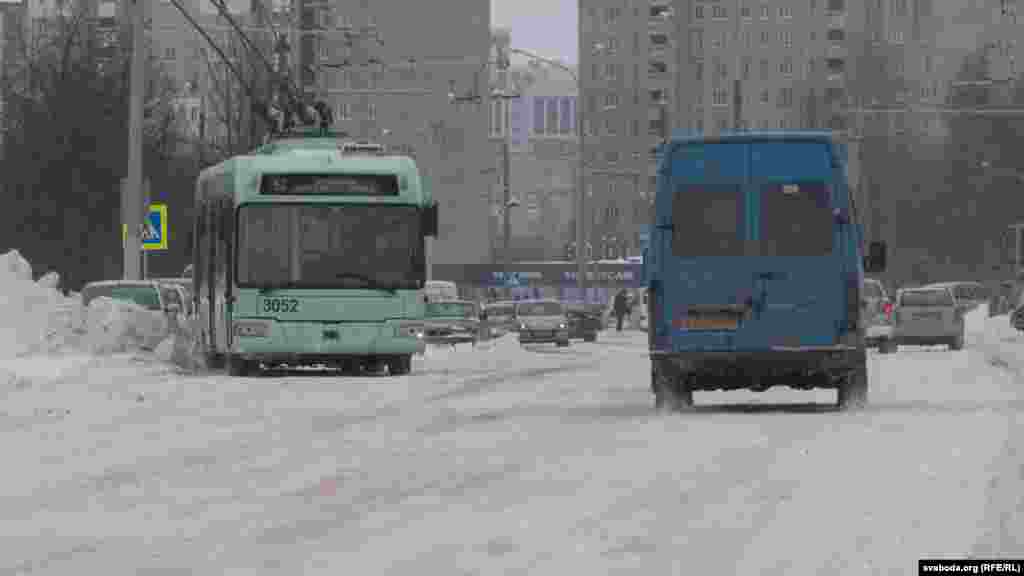 Тралейбус, што начаваў на прыпынку «Магнітная». Апоўдні суботай рух наземнага транспарту тут яшчэ не аднавіўся.