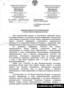 У папярэджаньні таксама адзначаецца, што «ў выпадку прадстаўленьня замежнай дзяржаве, замежнай ці міжнароднай арганізацыі заведама непраўдзівых зьвестак пра палітычнае, эканамічнае, сацыяльнае, вайсковае і міжнароднае становішча Рэспублікі Беларусь, прававое становішча грамадзян РБ, якія дыскрэдытуюць РБ і яе органы ўлады», журналіста могуць прыцягнуць да адказнасьці.
