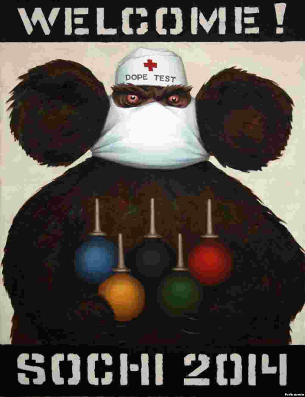 На малюнках у сатырычнай форме маляваліся алімпійскія кольцы ў выглядзе шыбельнай пятлі, мядзьведзік — сымбаль алімпіяды, які топча фігурыстаў, альбо Сталін, які хаваецца пад маскай бяскрыўднага мядзьведзіка.