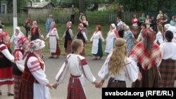 З двух бакоў вялікай вёскі зь песьнямі й карагодамі кабеты й маладыя дзяўчаты рухаюцца ў цэнтар: