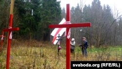 З дарогі добра відаць некалькі крыжоў, пастаўленых у розныя часы паводле ініцыятывы прадстаўнікоў розных партый і рухаў. Самы вялікі крыж з надпісам «Ахвярам таталітарнага рэжыму» ўзвышаецца над іншымі. На гэтыя крыжы Аляксандар Салаўян навязаў сёньня бел-чырвона-белыя стужкі. Потым былі ўзьнятыя нацыянальныя сьцягі, і над месцам сталінскіх расстрэлаў прагучала малітва «Ойча наш».