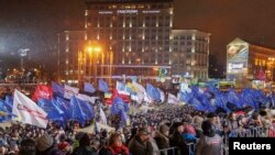 У Кіеве ад сёньня функцыянуе адзіны Эўрамайдан. Удзельнікі «партыйнага» намётавага лягера на Эўрапейскай плошчы аб’ядналіся мінулай ноччу з грамадзкім Эўрамайданам каля манумэнта Незалежнасьці, што разьмечшаны на Майдане Незалежнасьці.