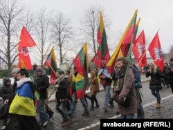Уніз да Майдану па вуліцы Інстытуцкай ідзе вялікая група маладых людзей пад літоўскімі сьцягамі. Сьпяваюць нешта сваё, але гучна. З тратуара гучна крычаць дзьве дзяўчыны: «Літва! Дзякуй, што вы з намі».